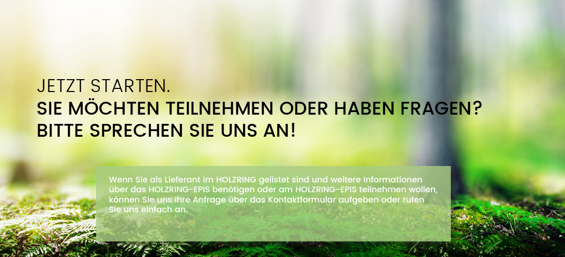 Wenn Sie als Lieferant im HOLZRING gelistet sind und weitere Informationen über das HOLZRING-EPIS benötigen oder an dem HOLZRING-EPIS teilnehmen wollen, können Sie hier Ihre Daten aufgeben. Alternativ können Sie auch unsere verantwortlichen Mitarbeiterinnen und Mitarbeiter direkt ansprechen. Die Daten dazu finden Sie auf der Seite Kontakt.